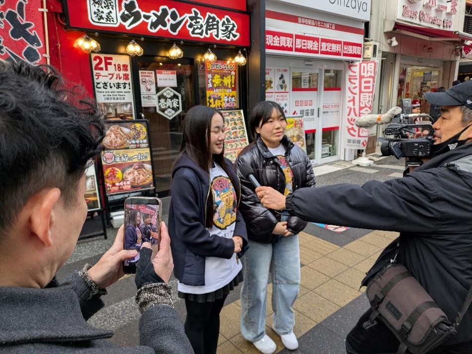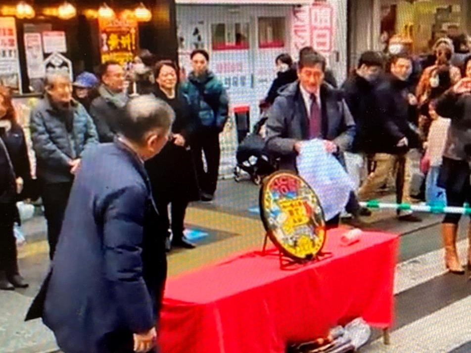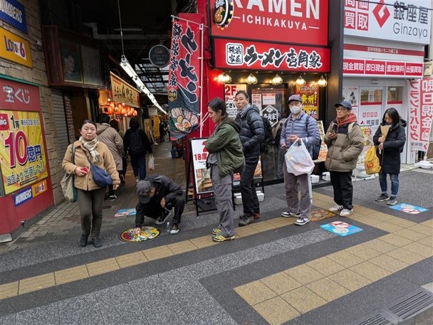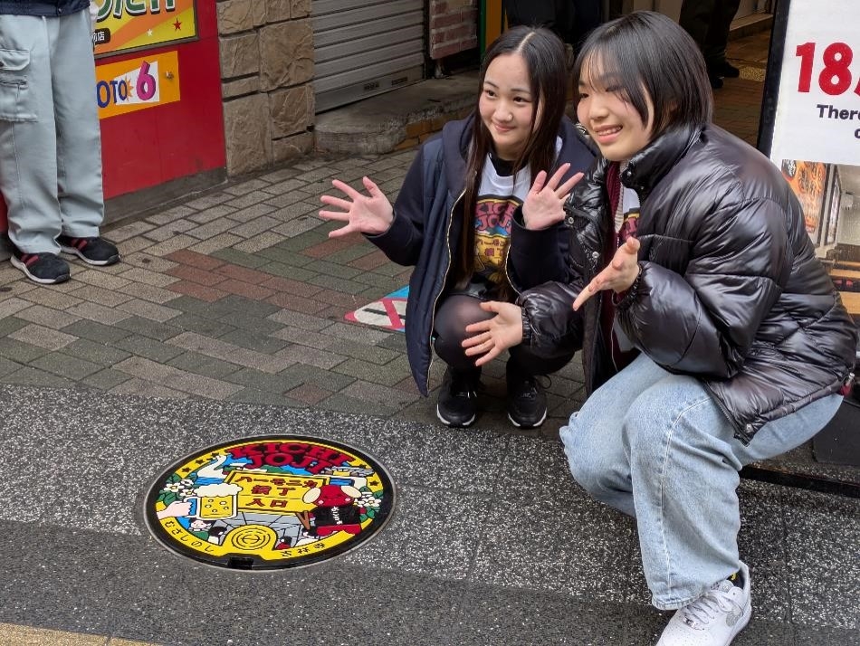 当日は、12時から本校生徒が抽選会会場を担当させてもらいました。福引きの音がする中、寒さに負けず生徒達が賞品を渡していました。賞品としては、本校の「ピーチ君の水」や本校生徒が表紙をデザインしたリポビタンDに加え、今回のイベントに因んだ「吉祥寺ハーモニカ横丁マンホールTシャツ」も配りました。