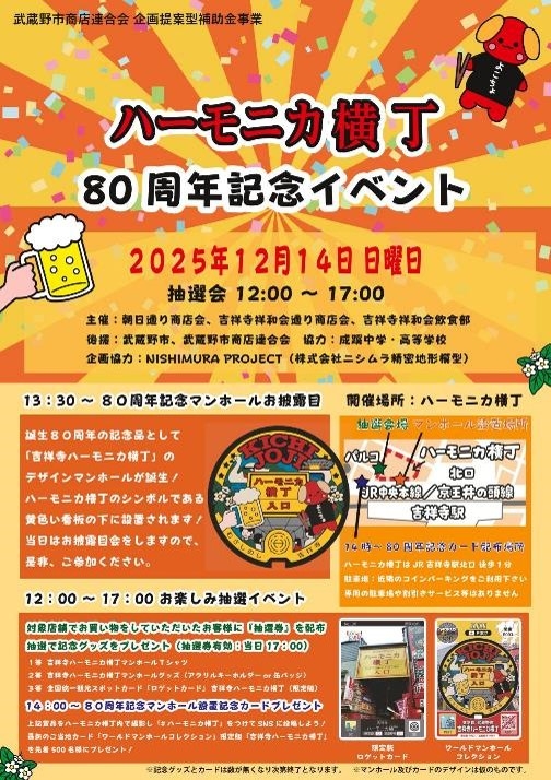 12月14日(日)、吉祥寺駅前のハーモニカ横丁の80周年記念イベントが開かれ、昨年に引き続き「よこちょ祭」の第二弾として、本校も抽選イベントを担当させていただき、ブースを持つことができました。