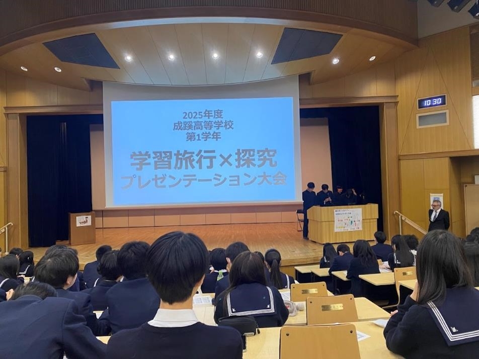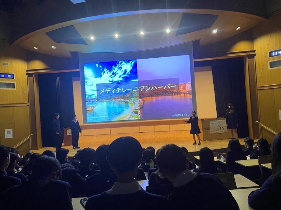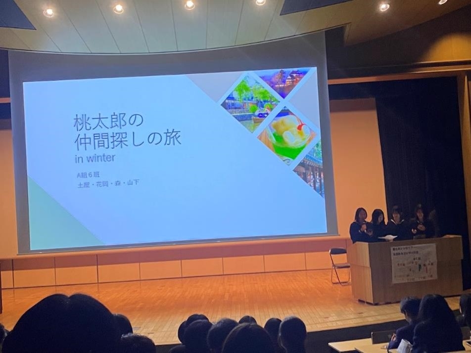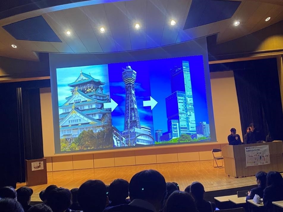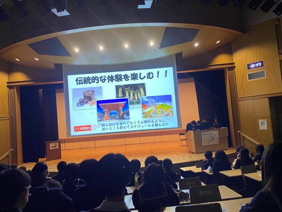 12月19日(金)、高校1年生が大学4号館で、旅行業者の方々を来賓として招き、「学習旅行✕探究 プレゼンテーション大会」を実施しました。本校は高校2年生で、方面別修学旅行である学習旅行を実施しています。その学習旅行の行き先を、高校1年生の時に生徒自らが考え、プレゼンして決める探究学習を行っています。