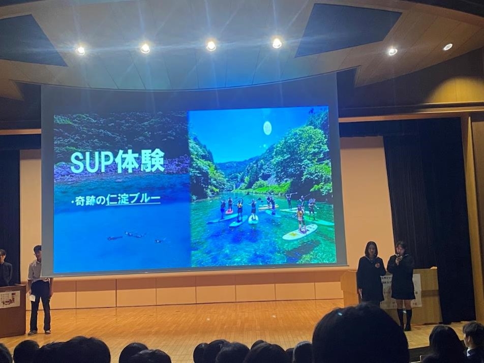 今年度、最終プレゼンに挙がった地域は、鹿児島、石川、大阪、岡山、長野、千葉、栃木、高知の8地域で、それぞれ工夫を凝らしたプレゼンが行われました。優勝は、「大地の声を聞く秘境の旅」と銘打った高知県チームで、仁淀ブルーでのSUP体験など、ワクワク体験が詰まっており、プレゼン力も高かったです。準優勝は建築に着目した大阪チーム、第3位は忘れられない旅を企画した鹿児島チームでした。校長特別賞は、「桃太郎伝説」を切り口とした岡山チームとしました。桃太郎の切り口は旅を楽しくさせるうえ、私の気持ちがそそる鬼ノ城や備中松山城が入っており、とても魅力を感じたからです。