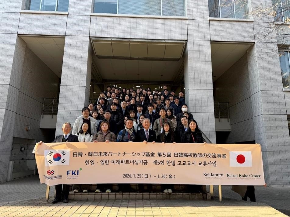 1月27日(火)、日本経済団体連合会(経団連)が韓国経済人協会と共に、未来志向の日韓関係構築に向けて創設した「日韓・韓日未来パートナーシップ基金」の事業の一環として、韓国における若手の高校の先生50名が本校に来校しました。この事業の目的の一つである、若手人材の交流促進のため、本校では先生方や生徒との交流も行われました。
