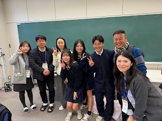 そして、大会議室に集まり、本校の先生や生徒と一緒にランチをとり、懇談も行いました。グループに分かれての話し合いでしたが、どのグループも和気あいあいとした雰囲気となり、とても盛り上がっていました。本校では第2外国語を演習の形で7・8時間目に置いており、韓国語は人気があって、年度末には授業でチマチョゴリを着た姿が見られます。それだけに、韓国の先生方と話をするのは、グローバル教育を進めるうえでも価値ある経験になったと思いました。この後、韓国の先生方は歌舞伎鑑賞があるため、短い懇談となってしまいましたが、生徒達の別れを惜しむ姿が印象的でした。最後は、中央館の正面玄関で記念写真を撮り、生徒と共に見送りました。
