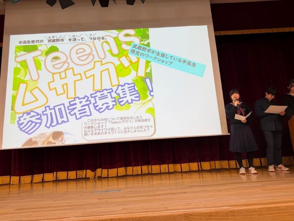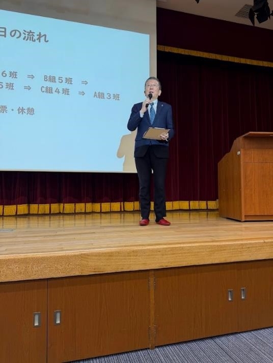 今回は、夏の学校で民泊などを行った長野県の状況と対比しながら、生徒達が現在通っている武蔵野市という地域をもっと良くする取組を提案するものです。クラスで選抜された代表の7チームがプレゼンテーションを競いました。昨年に続き、武蔵野市役所との連携を行ったことから、今年は何と小美濃安弘市長にも来て頂きました。