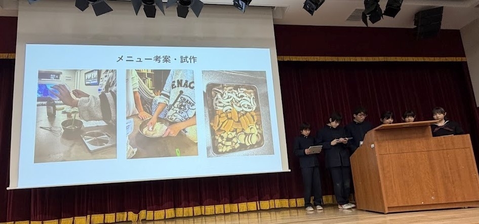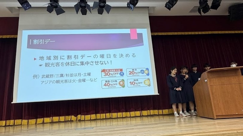 先生達の審査結果により、第3位までが発表されました。優勝チームは「わたしたちが考える新しい 『くらし地域応援券』」で、個人店への顧客が減少している問題に対応するもので、過去に武蔵野市が実施した 「くらし地域応援券」 の新バージョンを提案しました。アプリを使った方式は新鮮で、プレゼンも寸劇を取り入れるなど、工夫されていました。準優勝の「みんなで仲良く・地域の輪 ~地域づくり・コミュニティー~」は、取組の途中で課題を変更するという壁にぶつかっても、それを超えてくれました。頭で考えた課題には限度があります。そのため、探究学習では、フィールドワークやインタビューが重要になってくるのです。そして、第3位の「多文化共生社会に向けて」では、実際に市内のお店に自作したメニューを提案しており、実現したら私も食べに行きたいと思いました。