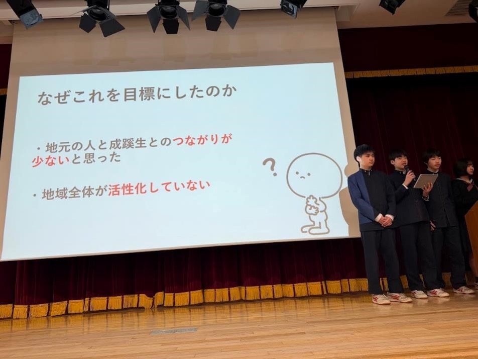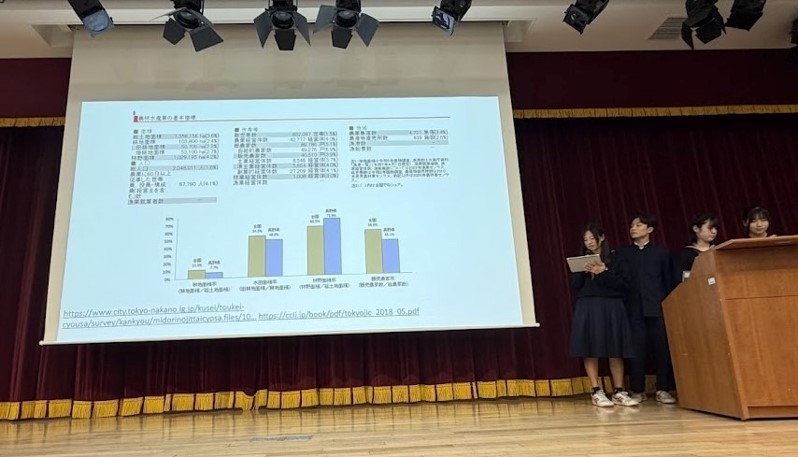 発表したテーマは、 F組の長野県と武蔵野市の農地面積や自然を比較した「新たな世代と自然 」、D組の生徒と地域の繋がりから活性化案を提案した「成蹊生と地域のつながり」、B組の武蔵野市の店にヴィーガンやベジタリアン向けのメニューを提案した「多文化共生社会に向けて」、G組の武蔵野市に水を供給する多摩地域の森の減少を止める対応策を提案した「武蔵野市の森林減少について」、E組の商店街に人が集中し混雑することの解決案を提案した「住みやすさと魅力的なまちづくりの両立」、C組の学校と地域との関わりを増やす提案を行った「みんなで仲良く・地域の輪 ~地域づくり・コミュニティー~」、そしてA組の個人店への顧客を増加させるために武蔵野市の「くらし地域応援券」の新バージョンを提案する「わたしたちが考える新しい 『くらし地域応援券』」の7つです。長野県での生活を踏まえたことから自然を意識したものが目立ったほか、武蔵野市との地域連携を深掘りし、その対応策をプレゼンする生徒達が多かったです。