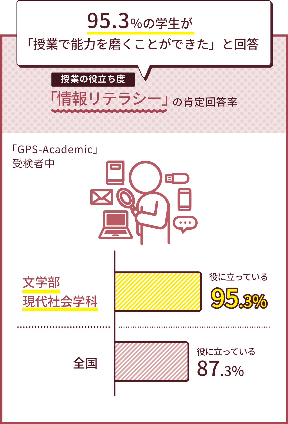 グループワークやディスカッションで培った力は、就職活動でも活かすことができました。まとめ役を多く引き受けたおかげで、インターンシップの際に「みんなの意見を引き出してまとめてくれるのがよかった」と評価いただいたり、その場で考える機会が何度もあったおかげで、面接で想定外の質問があっても対応できたりなど、現代社会学科で学んできたからこそ力を発揮できたと感じる場面がたくさんありました。大学卒業後は、銀行で働くことが決まっています。金融機関を選んだのは、あらゆる業界の方がクライアントになる可能性があり、社会について大学で幅広く学んだ知見を活かせるのではと考えたからです。また4年間で身につけた「聴く力」も現場で役立つと考えています。窓口にいらっしゃるお客様は、「本当に困っていること」や「してほしいこと」を必ずしもストレートに伝えてくれるとは限りません。そこでは、お客様が話しやすい雰囲気をつくりながら、その言葉をしっかり受け止めるコミュニケーションが大切になります。お客様一人ひとりと向き合い、信頼関係を築いていける銀行員になることが目標です。