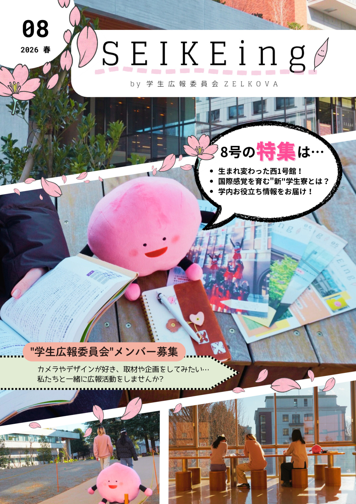 SEIKEing8号では、リニューアルした「西1号館」を徹底解剖! 学生ラウンジや設備の魅力を深掘りしています。また、2027年9月誕生予定の「新学生寮」や、知るだけで得する学内のお役立ち情報もお届け! さらに、私たちと一緒に活動する学生広報委員会の新メンバーも募集中! カメラやデザイン、記事作りに興味がある方は必見です!