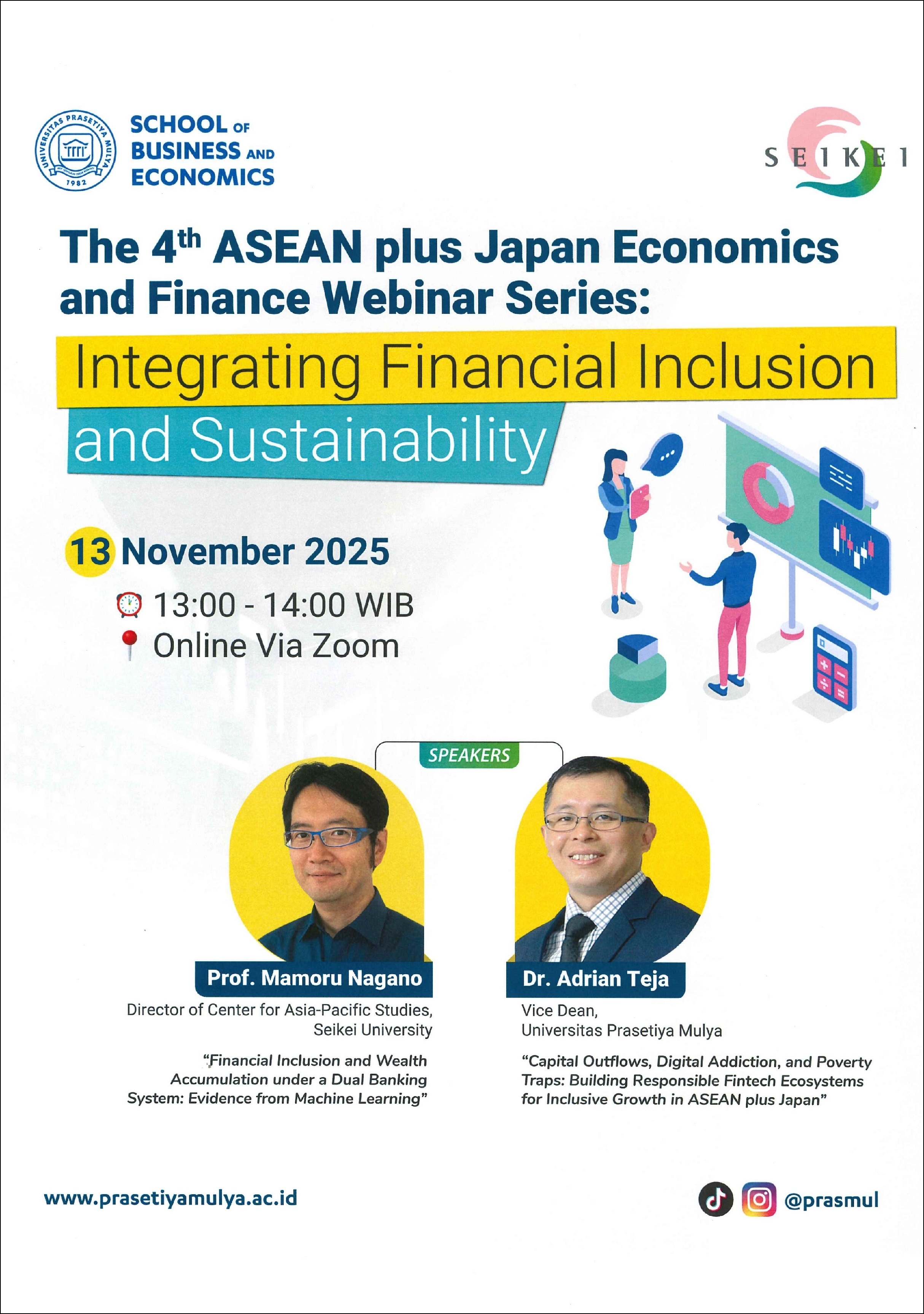 国際合同ウェビナー ASEAN plus Japan Economics and Finance Webinar Series: Integrating Financial Inclusion and Sustainability は成蹊大学、プラスティヤ・ムルヤ大学(インドネシア)、マラヤ大学(マレーシア)の3大学の経済・ファイナンス学者が参加するオンライン・セミナーです。第1回は成蹊大学とマラヤ大学により2024年6月19日に開催されています。
