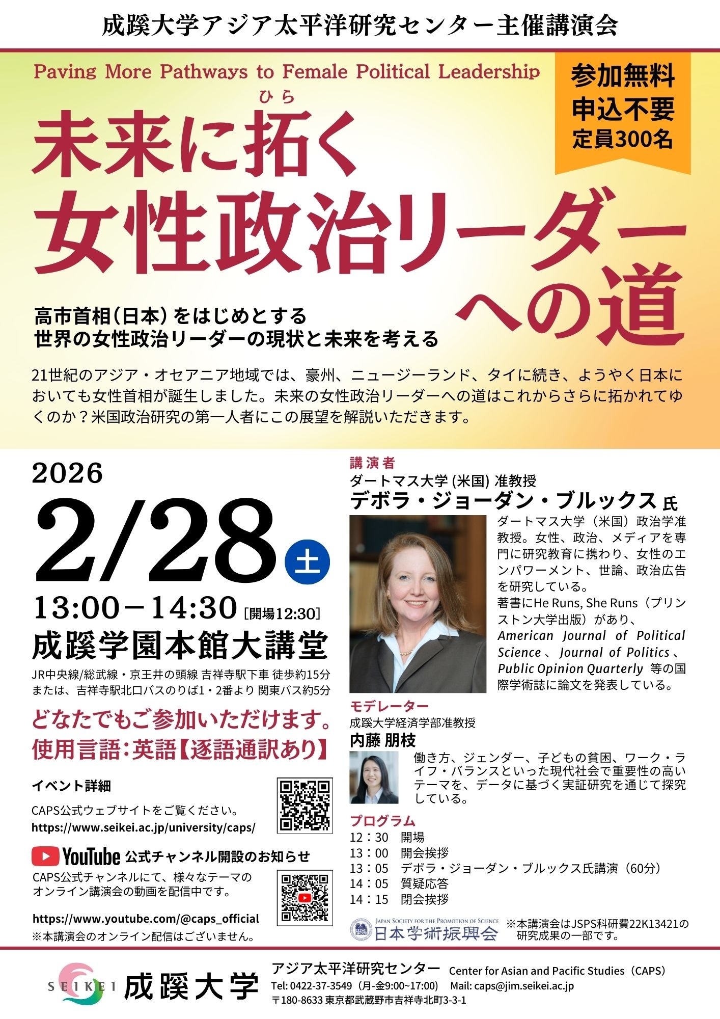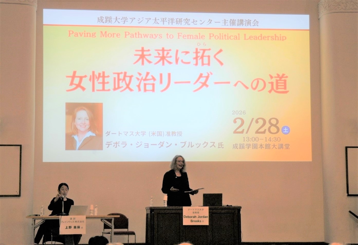 2026年2月28日に成蹊大学アジア太平洋研究センター(CAPS)主催講演会「未来に拓く 女性政治リーダーへの道(Paving More Pathways to Female Political Leadership)」が成蹊学園本館大講堂で開催されました。