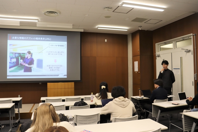 講義の後半、学生たちが向き合ったのは「未来のホスピタリティ」という大きなテーマでした。生成AIの急速な普及により社会が激変する今、ホスピタリティの現場はどのように変わっていくのか。講義では、JALが推進する最先端の事例を引き合いに、テクノロジーがもたらす「利便性」と、その先にある「人間の役割」について深い考察がなされました。