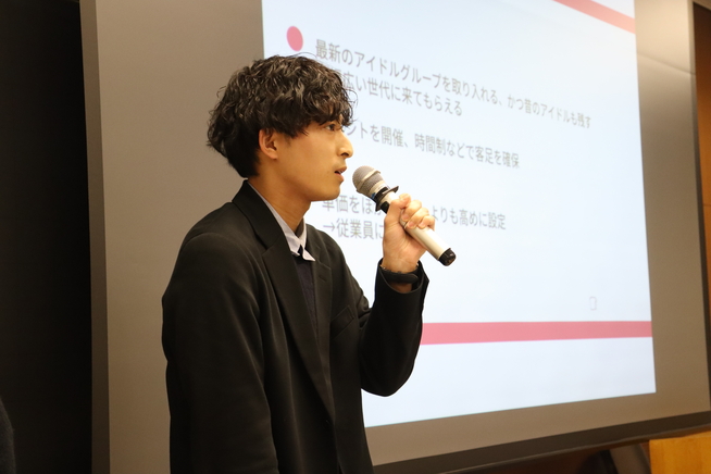 これまでの学びを活かした実践的な授業として、学生たちはグループワークでテーマに取り組み、その提案発表に臨みました。与えられたテーマは、10年後の未来を見据えたカフェの提案。単なるおもてなしのアイディアに留まらず、『顧客』『従業員』『経営者』という、立場によって異なる3つの視点で他のカフェとの差別化を考えます。ホスピタリティ・マネジメント戦略も併せて紹介する学生たちにとって、理論を実践へと昇華させる難度の高い挑戦となりました。