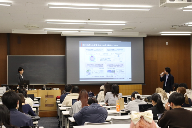 講座の後半では、ホスピタリティの基盤となる安全の観点からもホスピタリティを考えたり、AIやITといったテクノロジーがホスピタリティに与える影響に焦点を当て、変化していく社会におけるホスピタリティの役割について学びます。学生たちがグループワークを通じて「これからのホスピタリティのあり方」を考えながら、広い視野を養う機会を提供します。