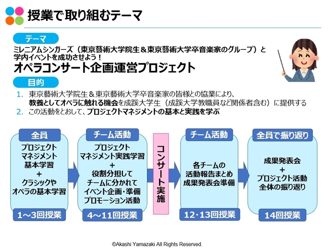全14回の授業では、ミレニアムシンガーズ様からオペラの基礎知識のレクチャーを受けたあと、3チームに分かれて、プロジェクトマネジメントの基本を学びながらオペラコンサート開催に向けて活動しました。