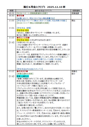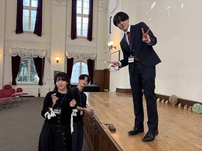 2025年12月10日、成蹊大学本館2F大講堂にてオペラコンサートを開催しました。当日は2チーム全員で役割分担し、準備から撤収まで力を合わせて運営しました。経営学部以外の学生も多く参加し、教職員も含めて150名近い方々が来場されました。来場者アンケートでは100%が「満足」そのうち84%が「大変満足」と回答し、「初めてオペラを鑑賞して感動した」「聞いたことがある楽曲が多くて楽しかった」という声が多く寄せられました。