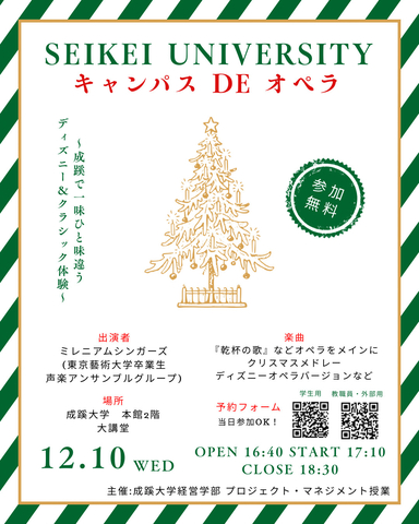 2025年後期は、昨年度に続いて東京藝術大学大学院生および東京藝術大学卒業生で構成される声楽アンサンブルグループ「ミレニアムシンガーズ」様のご協力により、成蹊大学在学生および教職員対象のオペラコンサート企画運営プロジェクトを行いました。