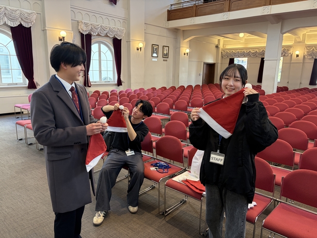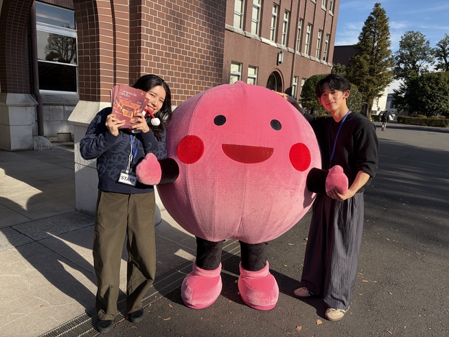 ポスター、看板、リーフレットなどを制作して学内での集客活動を行うとともに、会場設営、参加者の受付や誘導など、幅広い役割を担いました。学生食堂のテーブルにミニポスターを貼るなど、様々な工夫を凝らしました。最も盛り上がったのは、コンサート当日のピーチくんによるリーフレットの配布です。多くの学生に囲まれて宣伝活動にも熱が入りました。