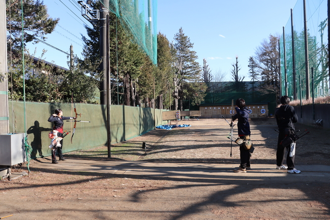 キャンパス内にアーチェリー射場があり、距離が30m・50mのショートハーフと70m・18m全距離が射てる充実した設備。広さはないので射てる人数は多くありませんが、工夫して使用しています。「空きコマは全て射場へ行く生活です!」と最大限に活用しています。