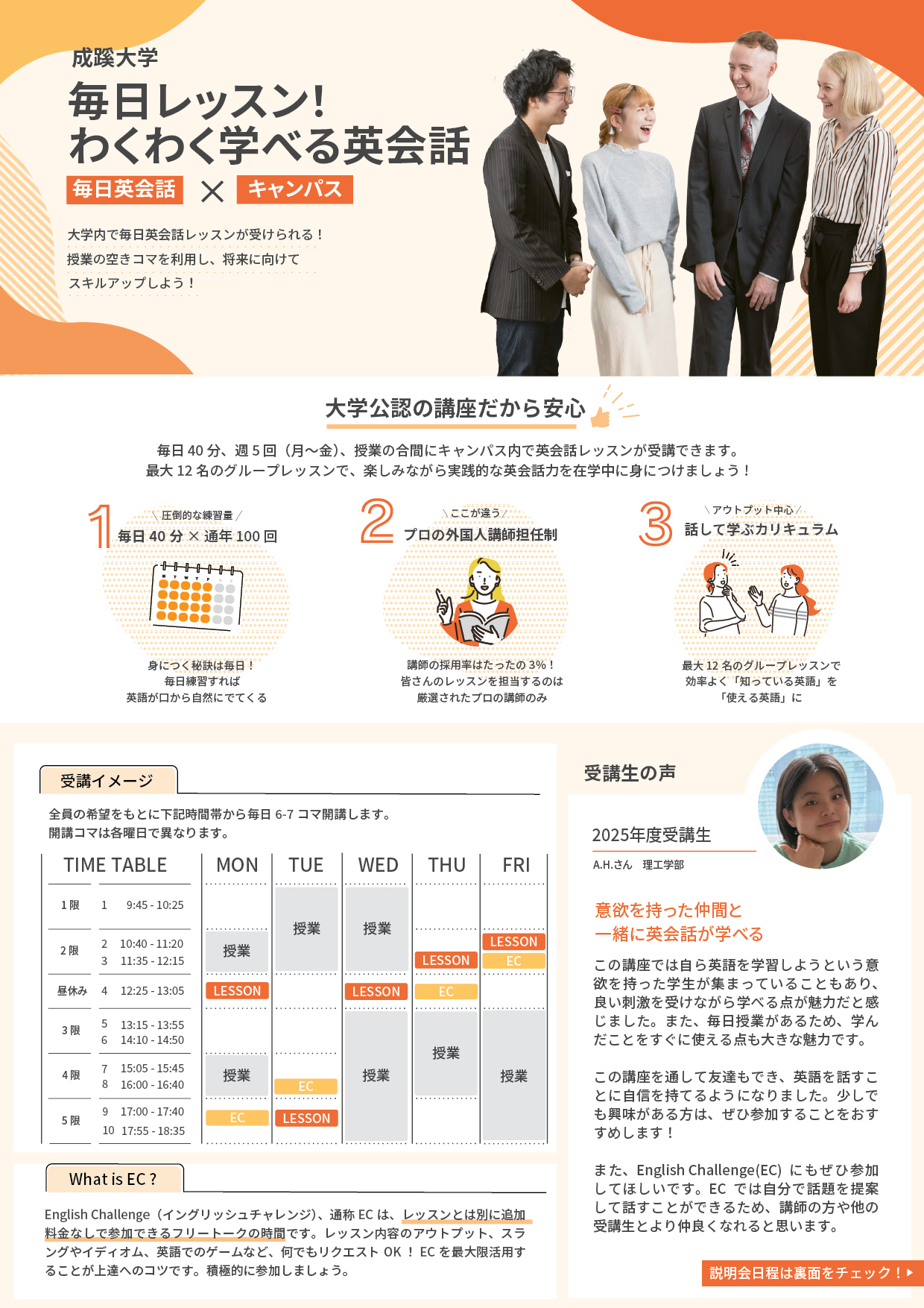 こちらは、毎日40分、週5回(月~金)、授業の合間にトーリウムで受けることができる英会話レッスンです。(※大学の正規授業ではありません。また、受講料がかかります。)