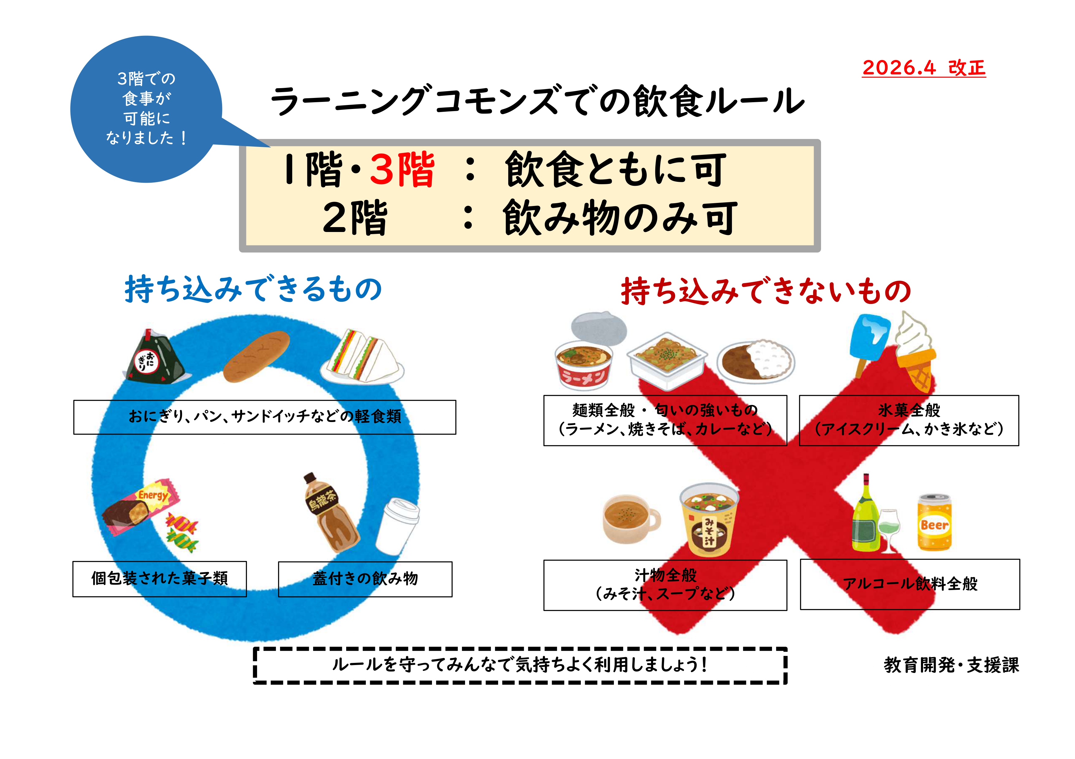これまで、食事は1階のみ可となっていましたが、2026年4月より、3階エリアでも軽食を含む食事ができるようになりました。
