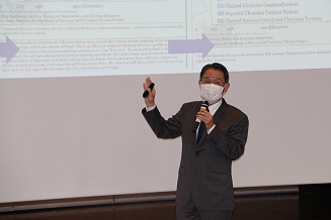 司会の竹内敬子文学部特別任用教授から、本講演会の趣旨説明と講師紹介が行われた後、倉井氏による講演では、ロシアはなぜ軍事侵攻したのか、何がウクライナの頑強な抵抗を可能にしたのか、出口戦略をどう描くか、わが国にとっての意味などを主たる論点として、在ウクライナ特命全権大使をはじめとするこれまでの豊富なご経験に基づく、詳細かつ大変わかりやすい解説をいただきました。