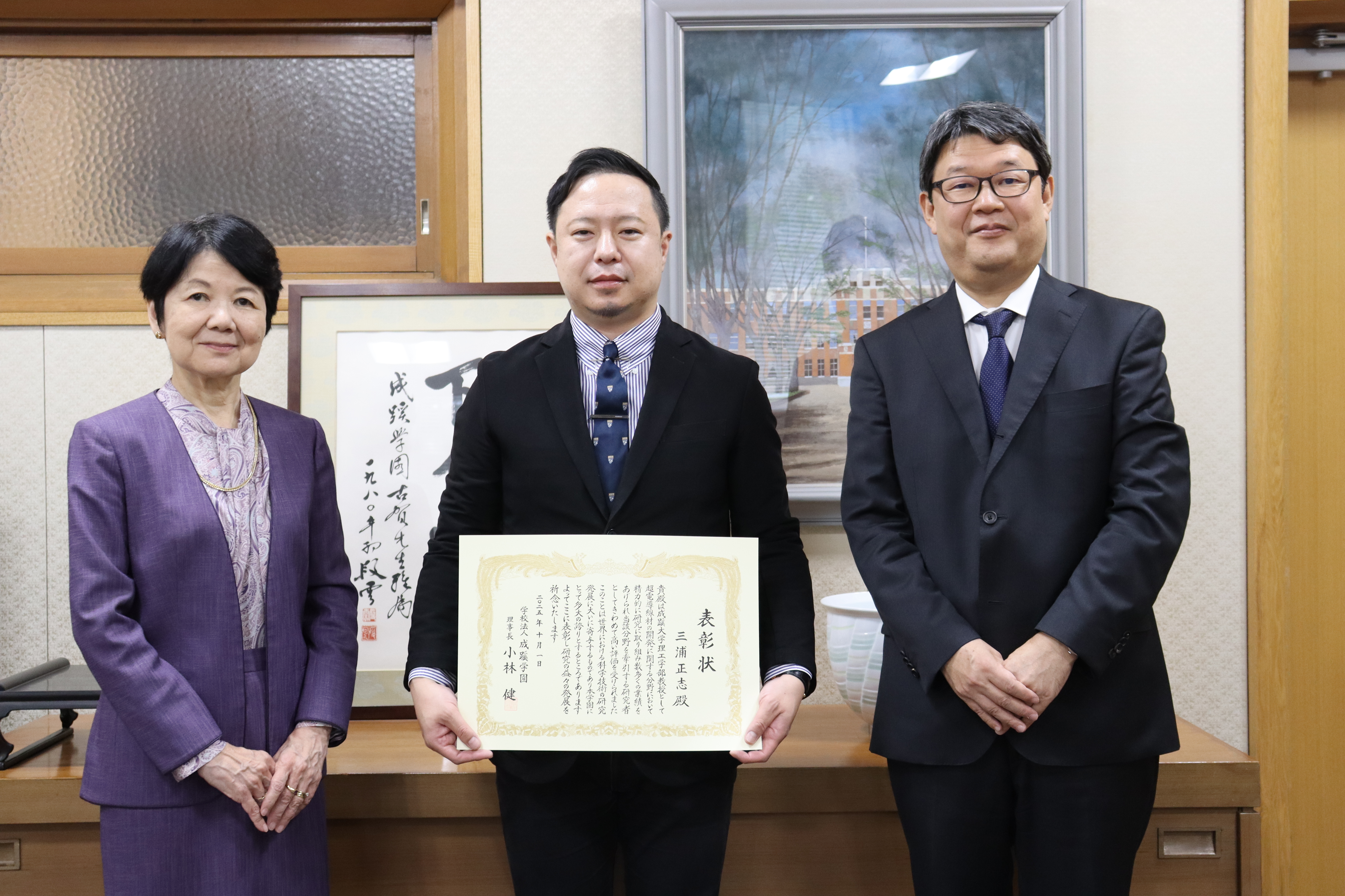 理工学部/大学院理工学研究科 三浦正志教授/リーディングリサーチャー(専門分野:電子・電気材料工学、電磁現象学、超伝導工学、結晶成長学)が 成蹊学園就業規則第32条および教職員表彰規則第3条の規定に則り、学術研究及び教育上特に功績があったとして、小林健理事長から教職員表彰されました。三浦教授が教職員表彰を受賞するのは、2014年に受賞したのに続き今回で2回目です。
