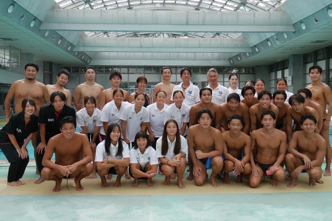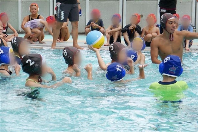 当日は、本学のコーチである元水球男子日本代表キャプテンの志水祐介選手(ほか2名)に加え、水球日本代表の野田選手、社会人水球チームと共に水球を通して子どもたちと水球アクアゲーム(本来の水球を簡略化したゲーム)を楽しみました。