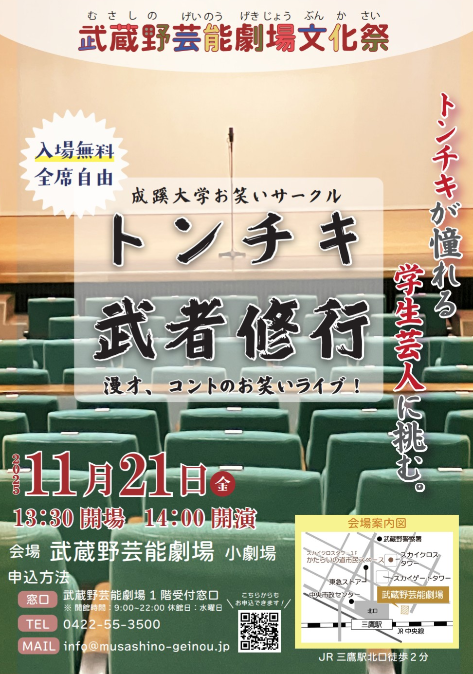 武蔵野芸能劇場との共催によるお笑いライブです。他大学お笑いサークルの学生芸人の方々にもご出演いただきます。