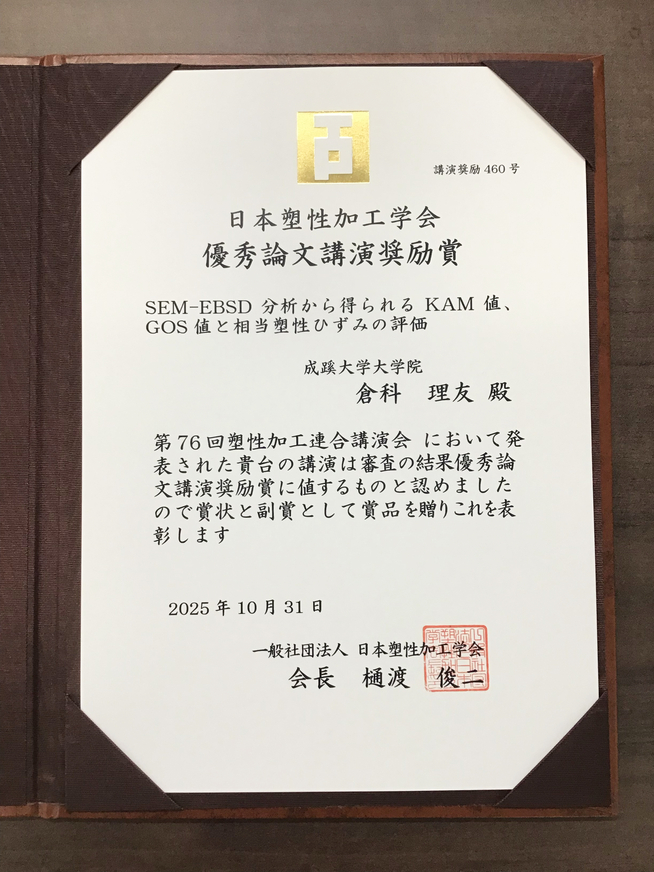 理工学研究科博士前期課程2年の倉科 理友さん(材料力学研究室:酒井 孝教授)が、2025年9月24日~25日に茨城大学で開催された第76回塑性加工連合講演会にて、優秀論文講演奨励賞を受賞しました。