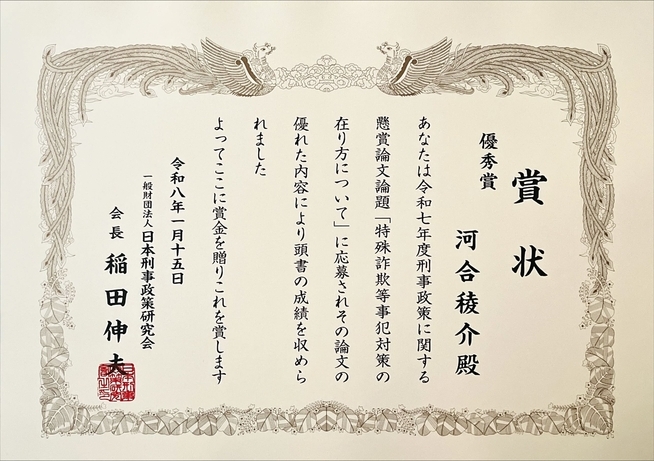 法学部法律学科3年 河合稜介さんの論文が、一般財団法人 日本刑事政策研究会「令和7年度刑事政策に関する懸賞論文」で『優秀賞』を受賞しました。