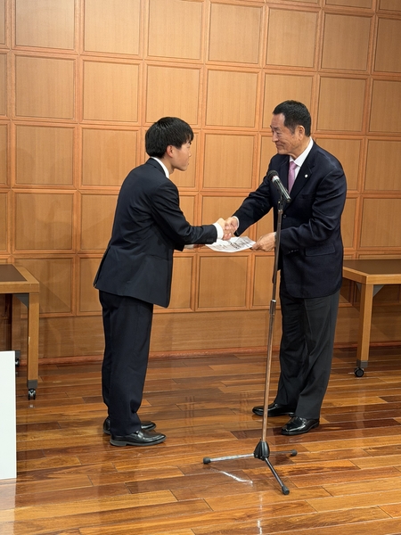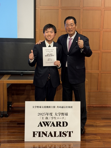 3月6日(金)、硬式野球部3年マネージャーの藤嶋学と信太監督が森雄一学長を訪問し、一般社団法人大学野球支援機構主催「2025年度 大学野球『主務』・『学生コーチ』・『アナリスト』AWARD」において、藤嶋がファイナリスト15名に選出されたことを報告しました。藤嶋は大学3年春に選手からマネージャーへ転身し、練習のサポートやチーム内の調整、対戦相手のデータ分析などを担い、選手が力を発揮できる環境づくりに尽力してきました。こうした取り組みが高く評価されたものです。