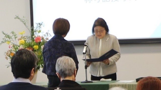 卒業制ではなく、学び続けるほど称号が上がっていく、生涯学習の成果証明といえるものです。今年度は36名の方が新たに称号を取得され、そのうち19名が式典に出席されました。武蔵野地域自由大学の乃南アサ学長より称号記の授与と式辞が述べられ、武蔵野市の小美濃安弘市長からは祝辞をいただきました。