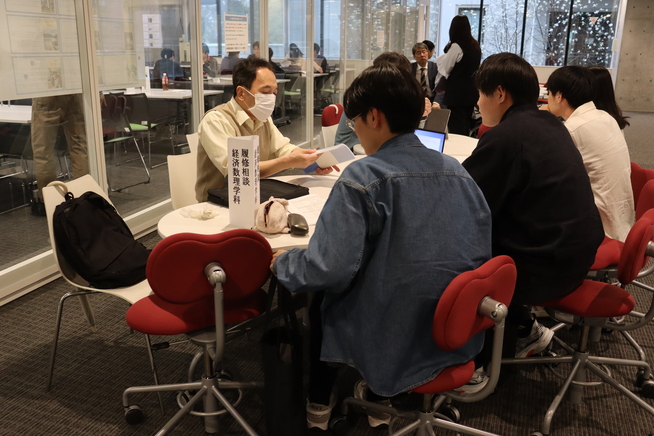 履修要項を広げながら、個々の希望を聞きつつ授業の組み方について直接アドバイスを受けられる貴重な機会となりました。