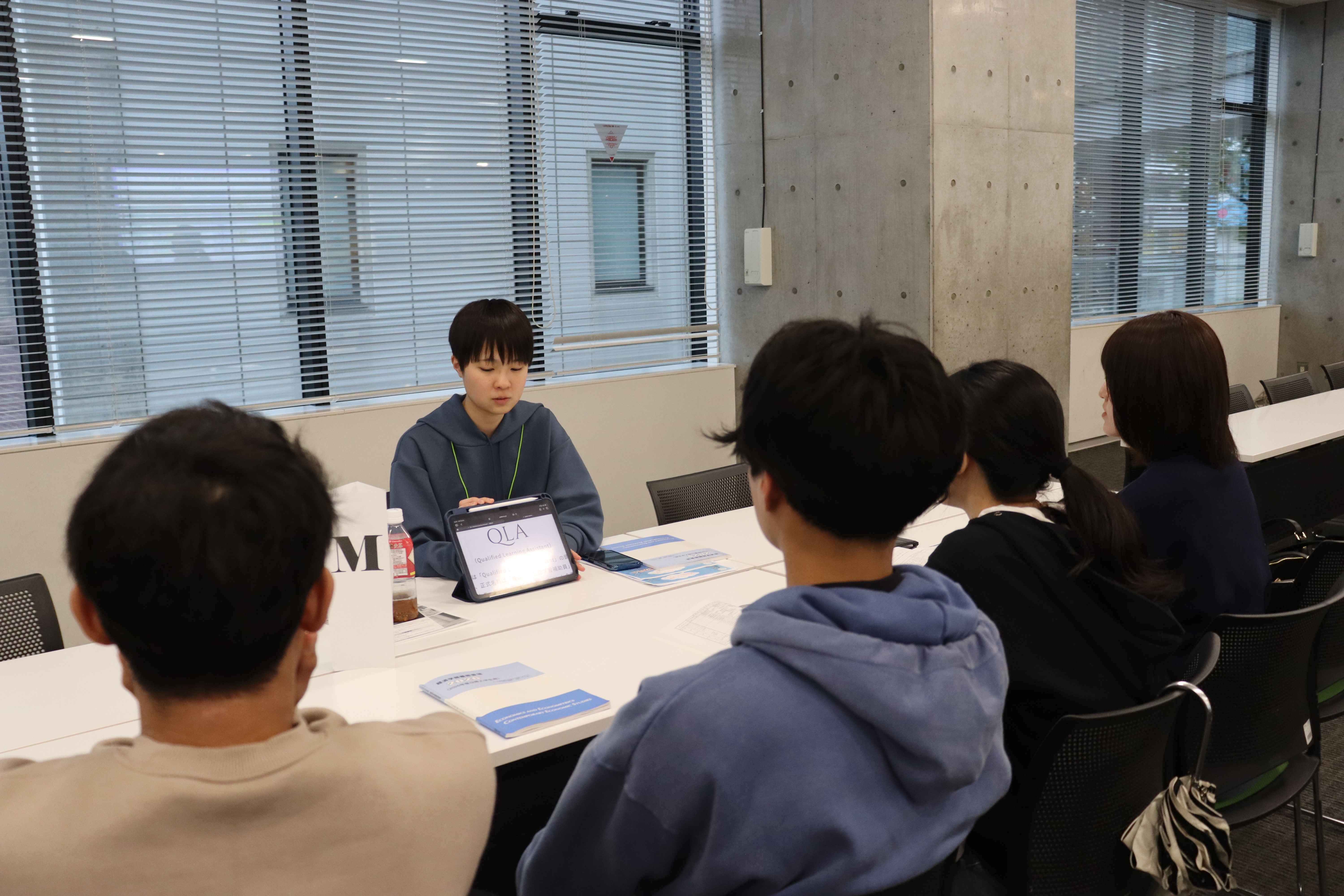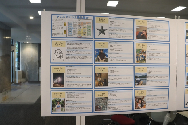 23名の上級生が「アシスタント上級生」として参加。1回18分の入れ替え制を4セット行い、新入生は「アシスタント上級生」の自己紹介を見て、興味のある経験を持つ上級生のテーブルを自由に訪ねました。