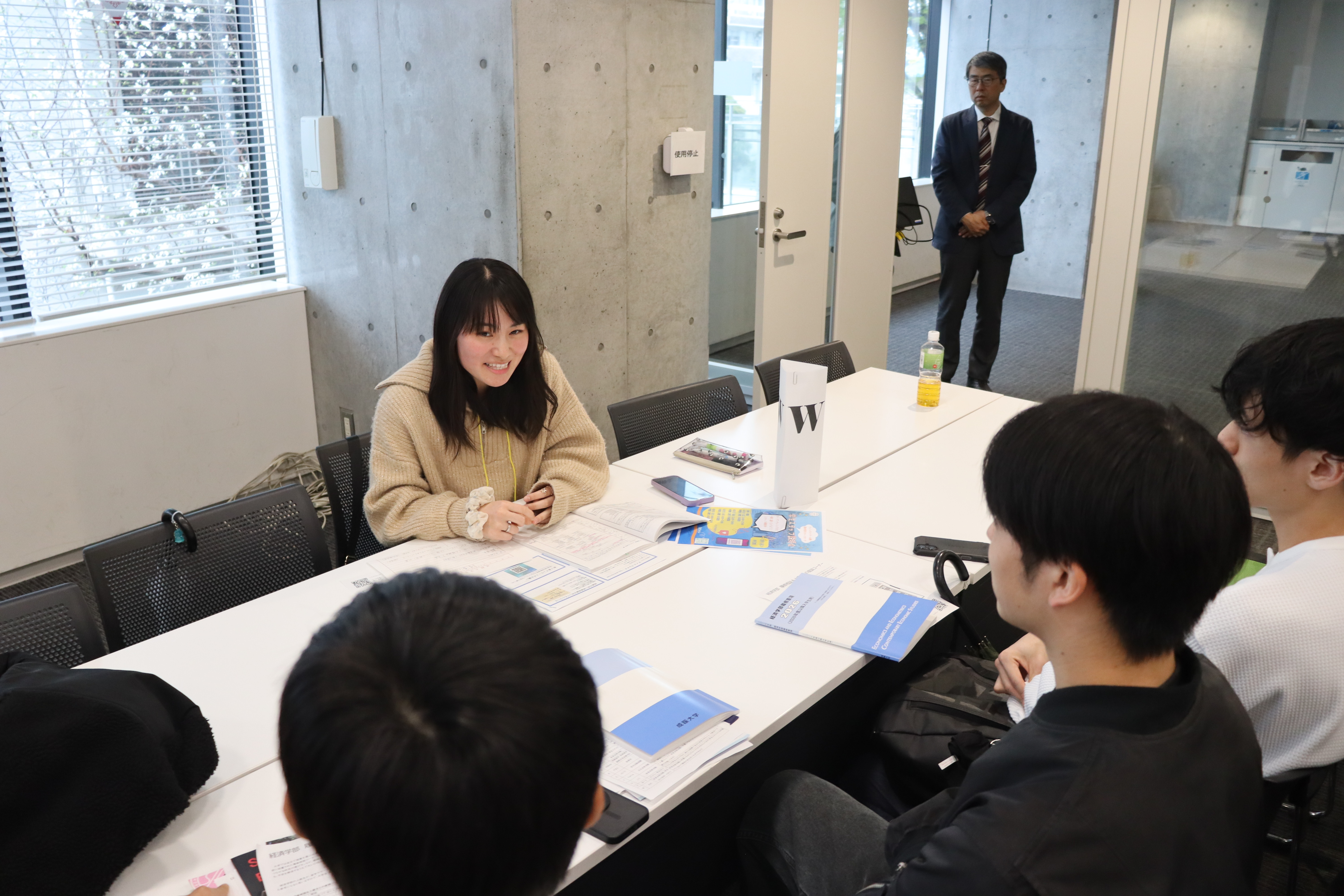 新入生は、「理系で経済学部に入学したがそのような学生はいるか」「留学前にどの程度英語が喋れた方がよいか」「アルバイトは自宅と学校のどちらに近い方がよいか」など様々な質問をし、大学案内だけでは分からない「学生生活の生の声」を真剣なまなざしで聞き入っていました。