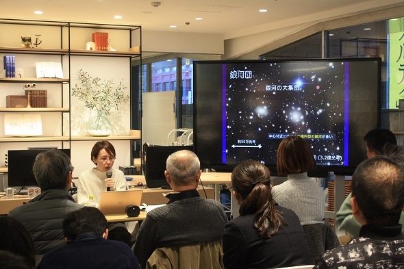 講演は、宇宙の広がり、すばる望遠鏡と観測成果、天体観測とデータ、天文学のこれから、という4つのテーマで話されました。すばる望遠鏡の観測データや、私たちに身近な例を用いながら、宇宙の全貌を明快に説明してくださいました。何光年、何億光年といった巨大なスケールの話は、私たちが生活している地球が宇宙に比べてとても小さいものだと改めて実感させるものでした。