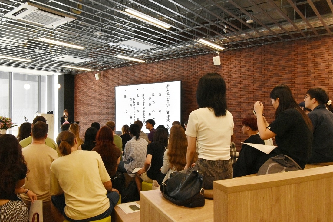 緊張した面持ちの留学生が入場し、歓迎式は始まりました。厳かでありながらも和やかな雰囲気の会場で、留学生一人ひとりの名前が呼ばれました。慣れない環境の中、力強く返事をした留学生の背中からは、これからの留学生活を謳歌しようとする意気込みが感じられました。