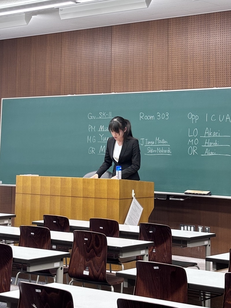 現在ESSでは、パーラメンタリーディベート、日本語で言うと即興型英語ディベートの練習、そして大会出場に励んでいます。