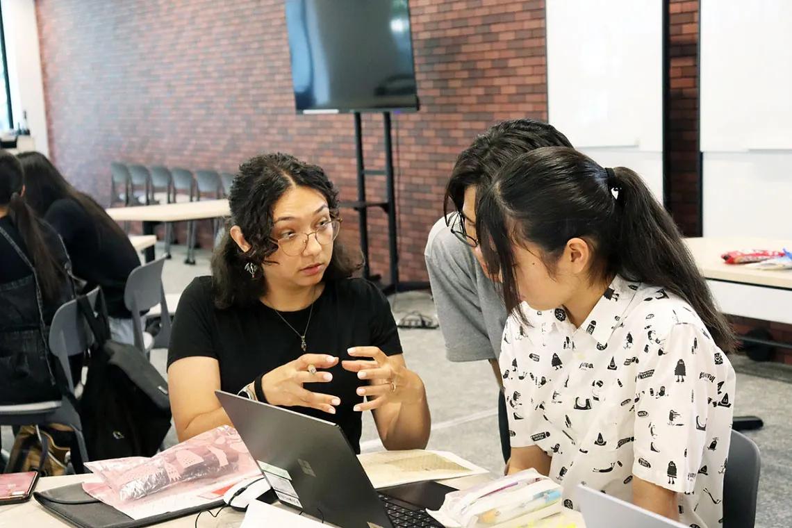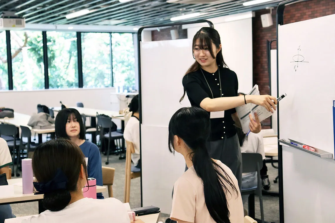 事前に自宅で基礎的な内容をオンラインで20分から40分の学習し、対面での授業に臨むことです。質問があればメッセージアプリで教員やTA(成蹊大生のアシスタント)とやりとりをすることができます。実際の授業はTAによる講義のあと、事前学習で学んだ内容をもとにグループディスカッション、ブレインストーミングなどのアクティブラーニングを中心に行います。