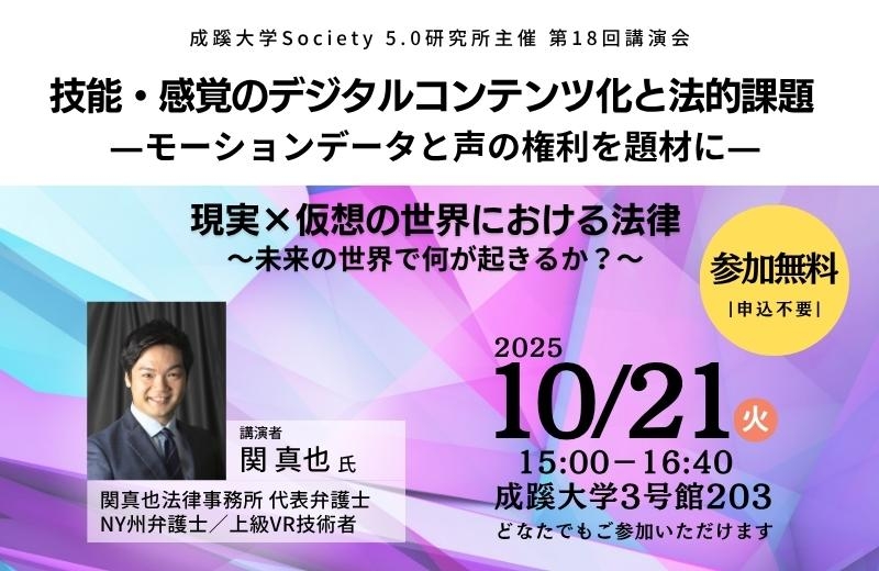 講演会 成蹊大学Society 5.0研究所主催 第18回講演会「技能・感覚のデジタルコンテンツ化と法的課題 ―モーションデータと声の権利を題材に―」 2025年10月21日(火)15:00~16:40開催