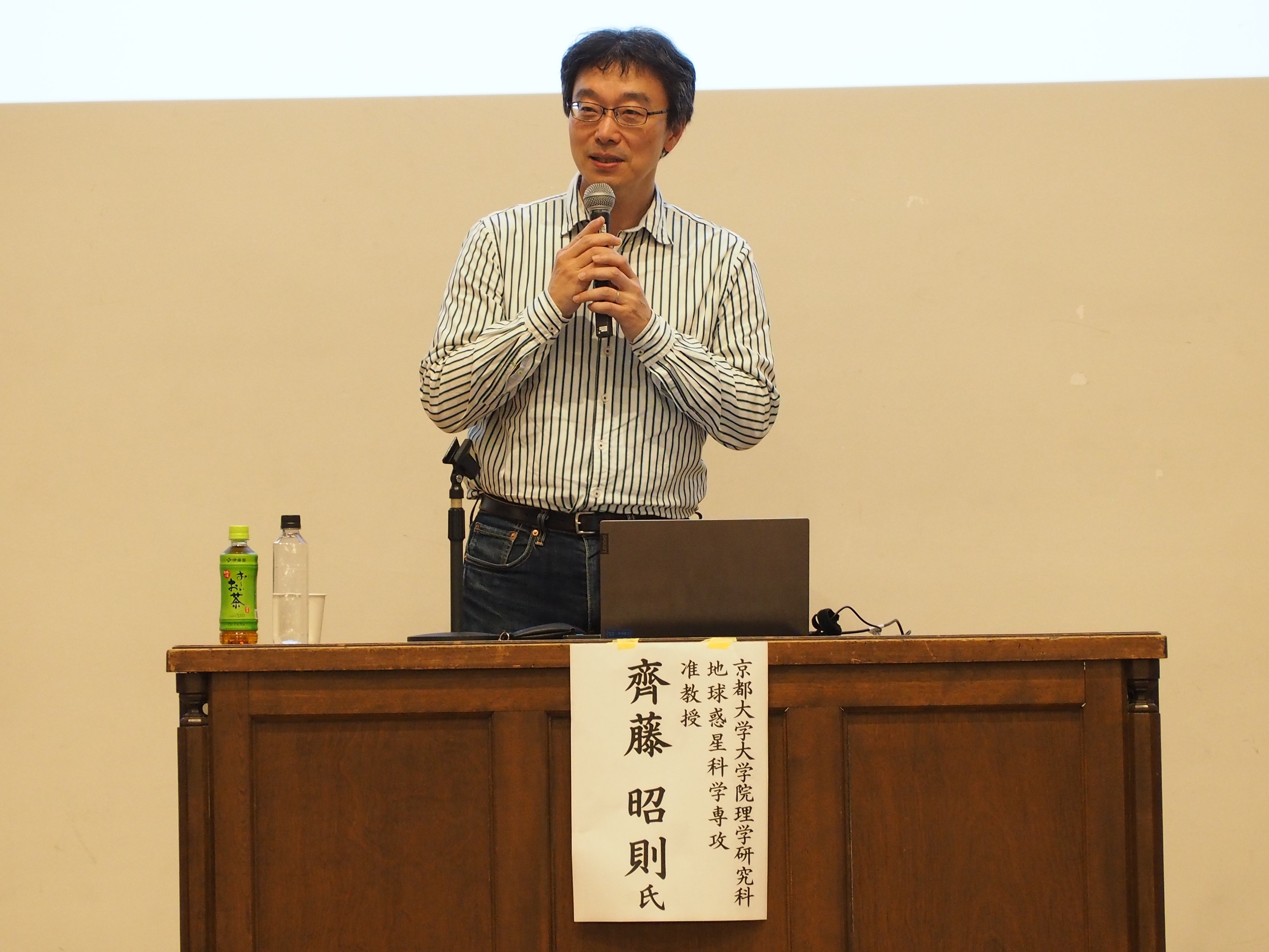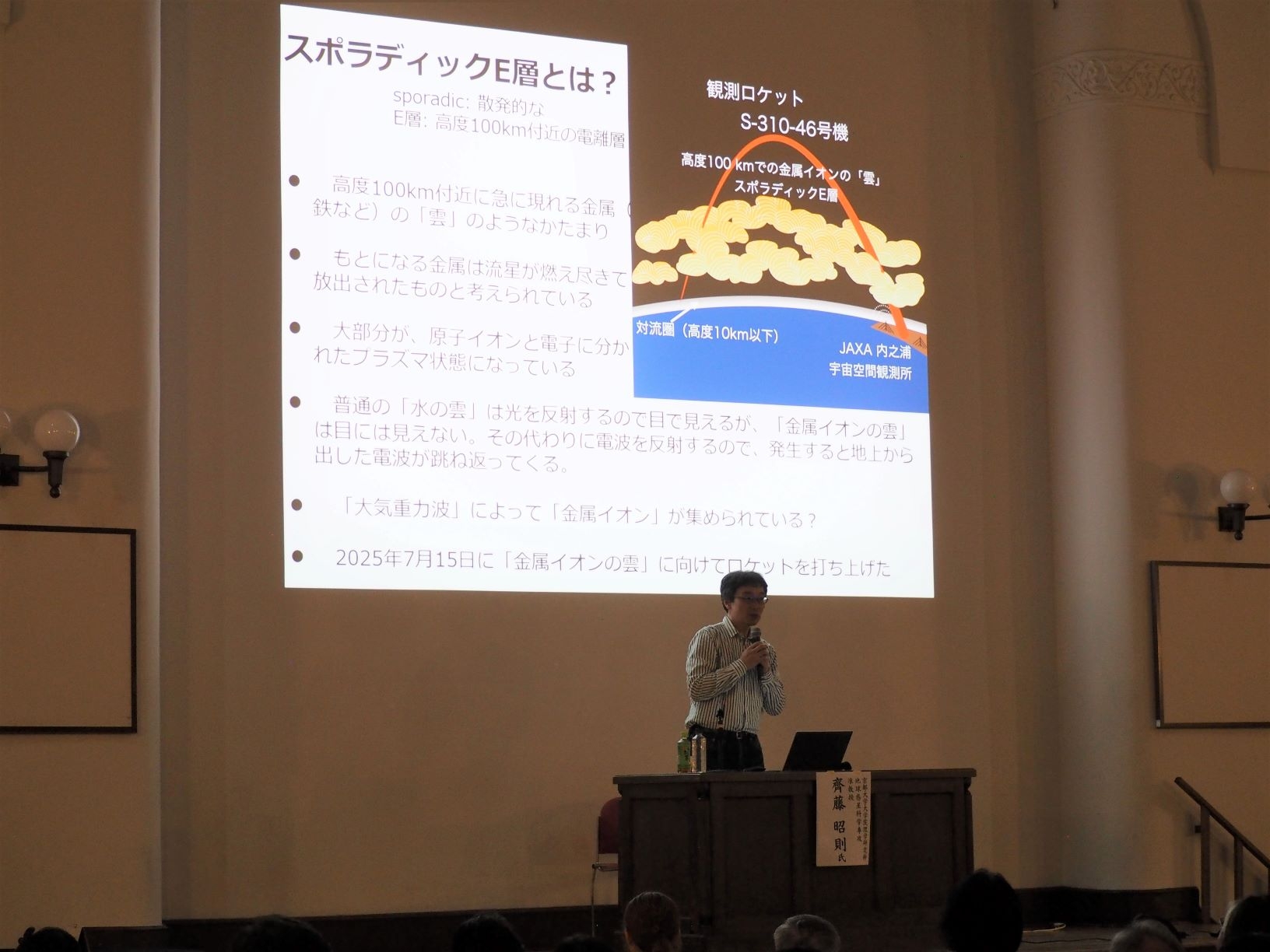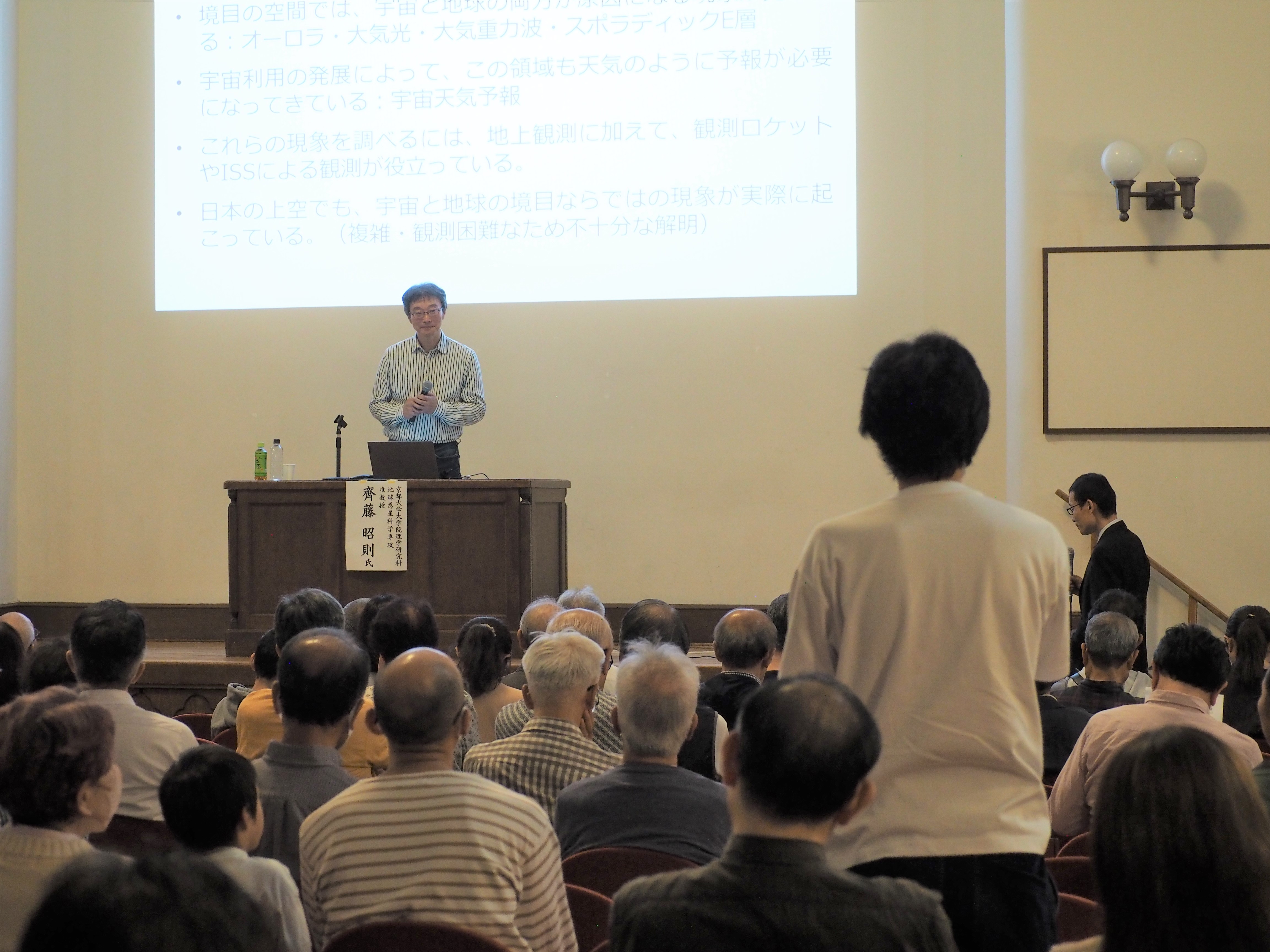 齊藤先生の御講演では地球と宇宙のはざまで起こる様々な現象を、映像や写真を交えてわかりやすくご説明して頂きました。国際宇宙ステーション(ISS)の日本実験棟「きぼう」に設置された観測装置により、オーロラや地表近くの雲以外にも、大気が光る様子(大気光)や電離圏にあるプラズマが太陽光を散乱した光(プラズマ共鳴散乱光)も鮮やかに観測されていました。この大気光の撮影により超高層大気が海のように波打つ現象(大気重力波)の分布の様子も捉えることができるとのことでした。また通信の障害の要因となるスポラディックE層の予測(宇宙天気予報)が宇宙開発においてますます重要性を増してきており、齊藤先生の研究チームでは今年の7月にもスポラディックE層の形成過程の解明のために新たな観測ロケットを打ち上げられ、今後データ解析を進めるとのことでした。