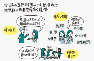 学生生活・学びと体験から得た力、学生の成長をイラストとインタビューを通して紹介します。