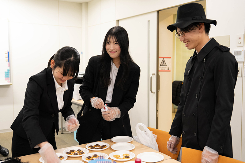 小林ゼミは、まさに体験探究型のゼミです。フィールドワークが多く、普段着ない服のジャンルのお店に入ったり、ハロウィーンで様々な国のスイーツを作ったり、その民族の服装をしてみようなどのテーマが必ず設定されます(写真は超正統派ユダヤ教徒の服装でユダヤ教のスイーツを作成中)。毎回テーマを与えられることで「やったことがない」に対して行動するきっかけができ、プレゼンテーションに向けた調査によって新しい知識が得られ、ディスカッションで刺激を受けることができます。体験を通して研究を深められるゼミです。