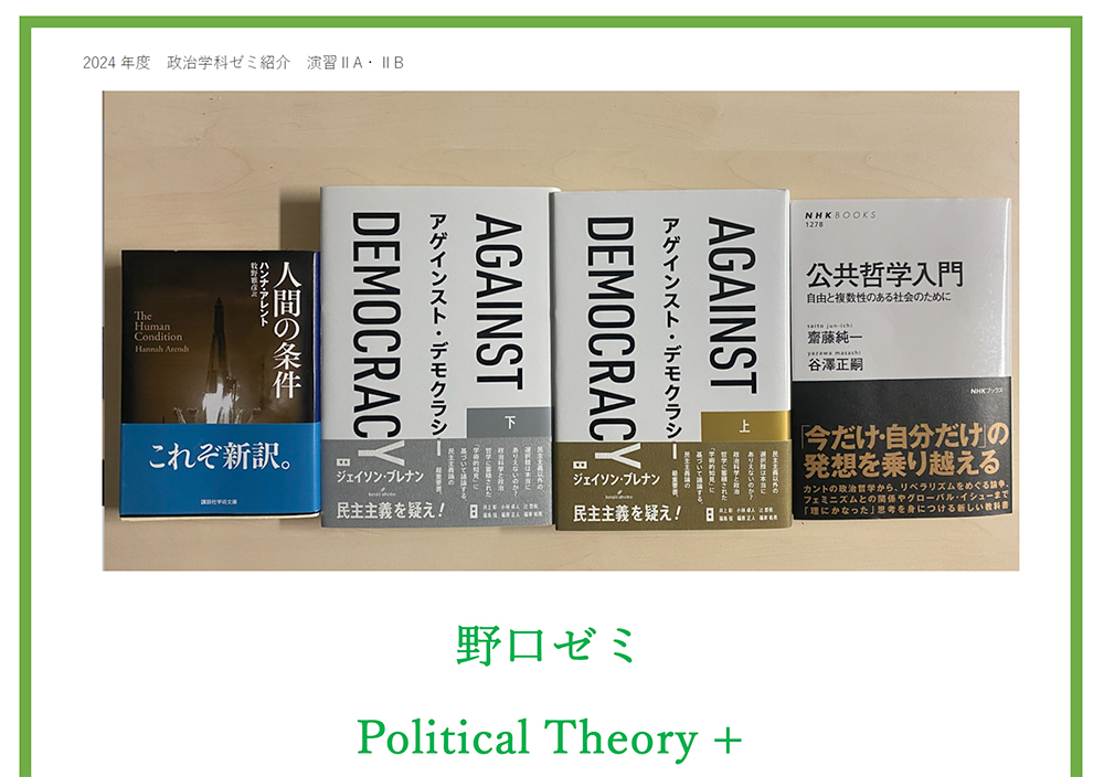 どうにも生きづらい世の中です。なんとかサバイバルしていかなければなりません。でも、個人ではどうにもならないことがあります。政治というのは、自分だけではどうにもならないことを、みんなで考えて、変えていく作業です。そして政治学はそのための学問です。少しでもマシな世界をつくることに貢献したいという思いを持つ(未来の)ゼミ生を応援します。