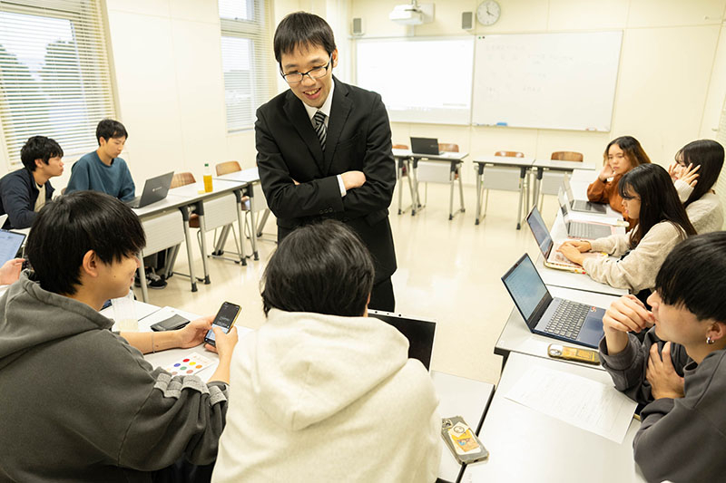 学生に寄り添い、成長を支えてくれる先生だと実感しています。ゼミでは、分野に縛られずに自由にテーマを決めて、やりたい研究に取り組むことができます。具体的な研究イメージが描けていないときなどは、丁寧に仮説の組み立てやデータ整理、結果の解釈まで伴走し、迷いどころでは基準を明確に示して導いてくれます。授業では、どの学生にも声をかけ、わからないところでは的確なアドバイスをくれるので、私たちも安心して研究を進められています。大教室の授業を受けるだけではわからなかったのですが、ゼミでは気さくに話をしてくれる優しい先生です。