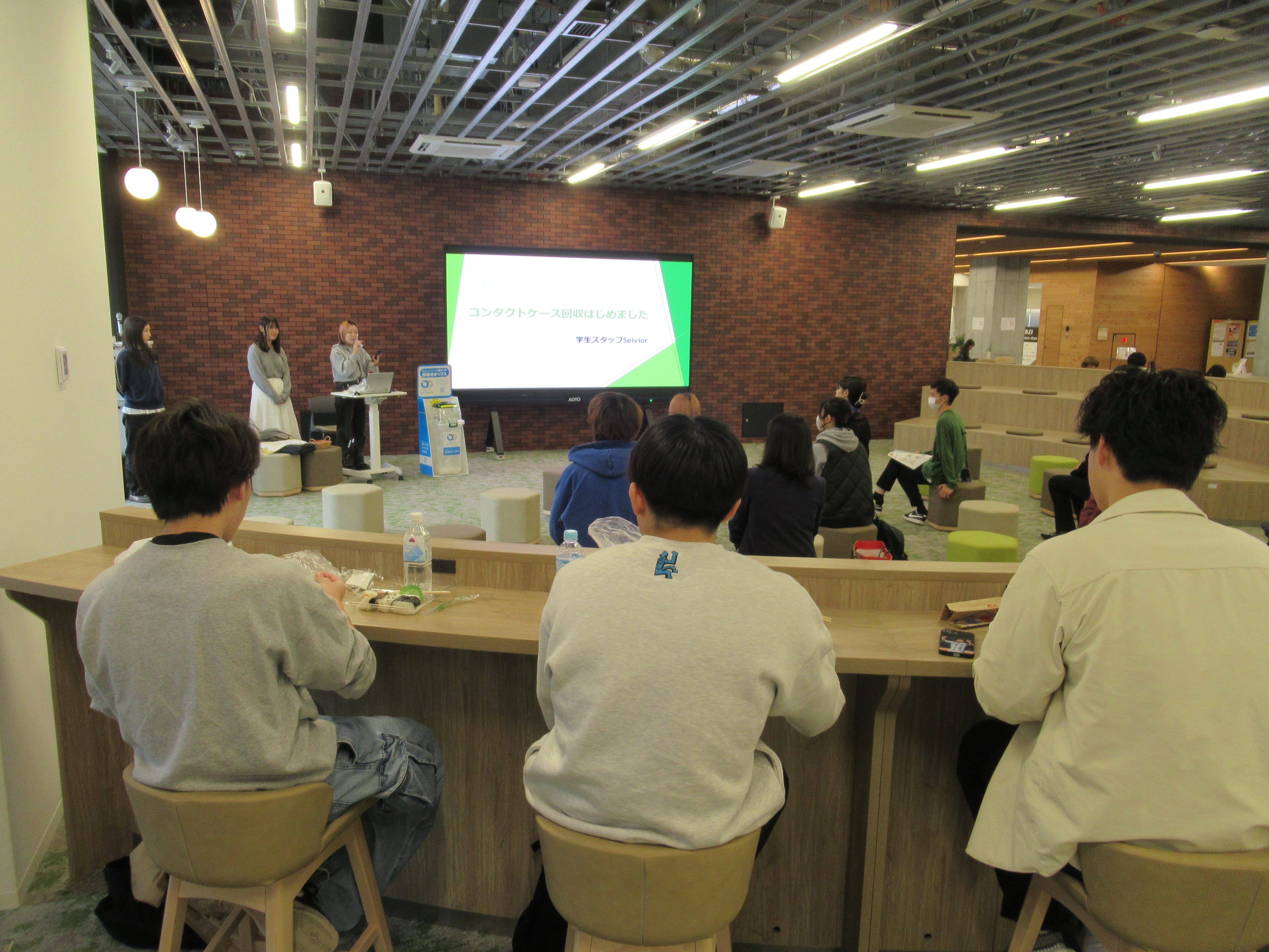【内 容】コンタクトレンズ空ケースをリサイクルすることで手軽にできる社会貢献活動とその意義を紹介した。同時に、回収ボックスを常設するボランティア支援センターの紹介もした。「コンタクトケースの回収が何に役立つかを理解できてよかった。」「ボランティア支援センターの新しい使い方を発見できた。」といった感想があった。