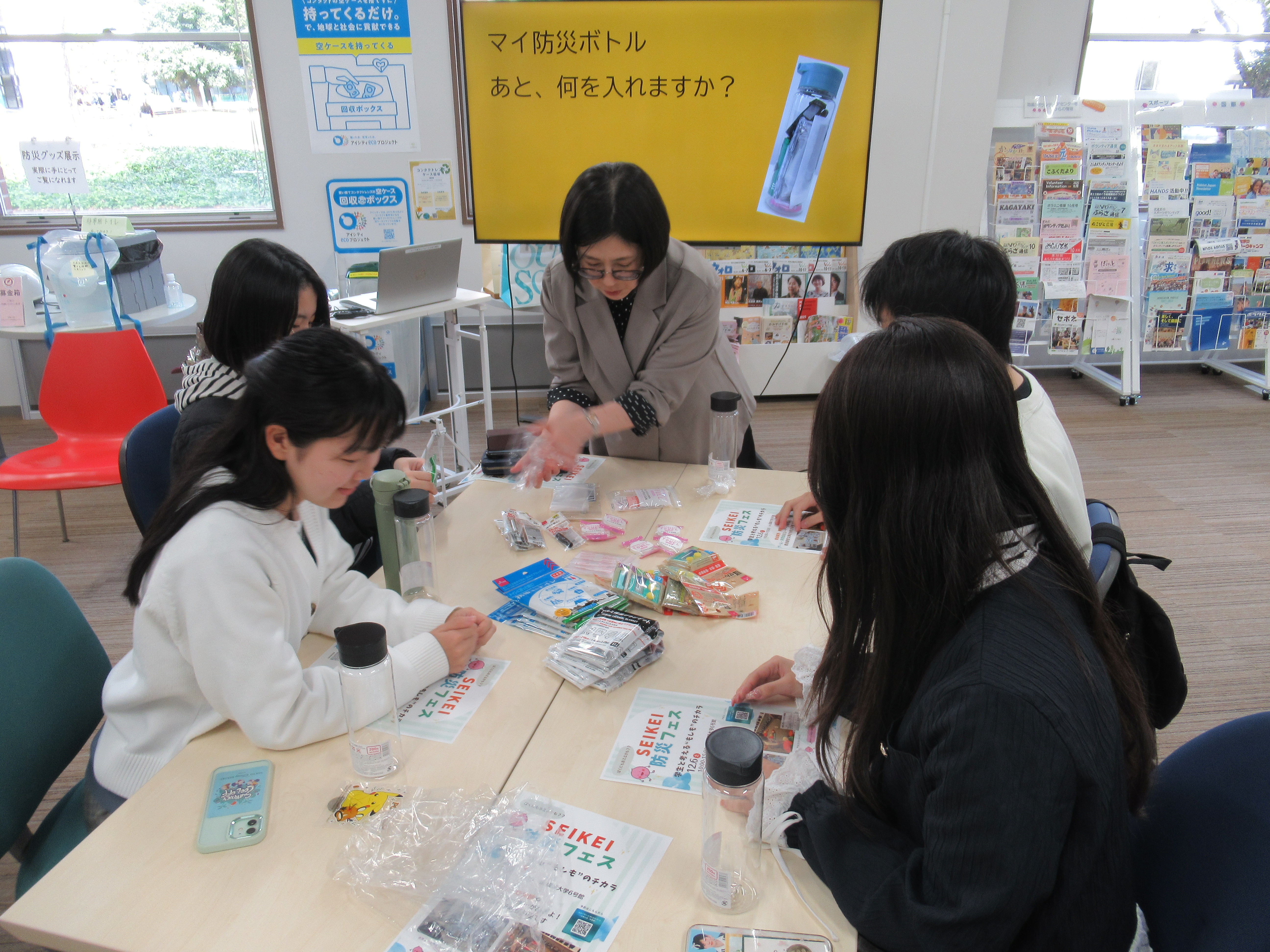 【内 容】100円ショップで買える防災グッズをドリンクボトルに詰めて非常用持ち出しボトルを作成するワークショップを行った。参加費(500円)全額は、10月20日(月)から10月31日(金)までボランティア支援センターで募金箱を設置した、赤い羽根「災害ボランティア・NPO活動サポート募金(ボラサポ)」(社会福祉法人中央共同募金会)へ全額寄付した。災害に対する備えや、社会貢献の方法として寄付があり、どう活用されるのかの説明を行い、参加者の防災意識を高めることができた。併せて、防災グッズの展示を行い、実際に手にふれる体験をすることができた。