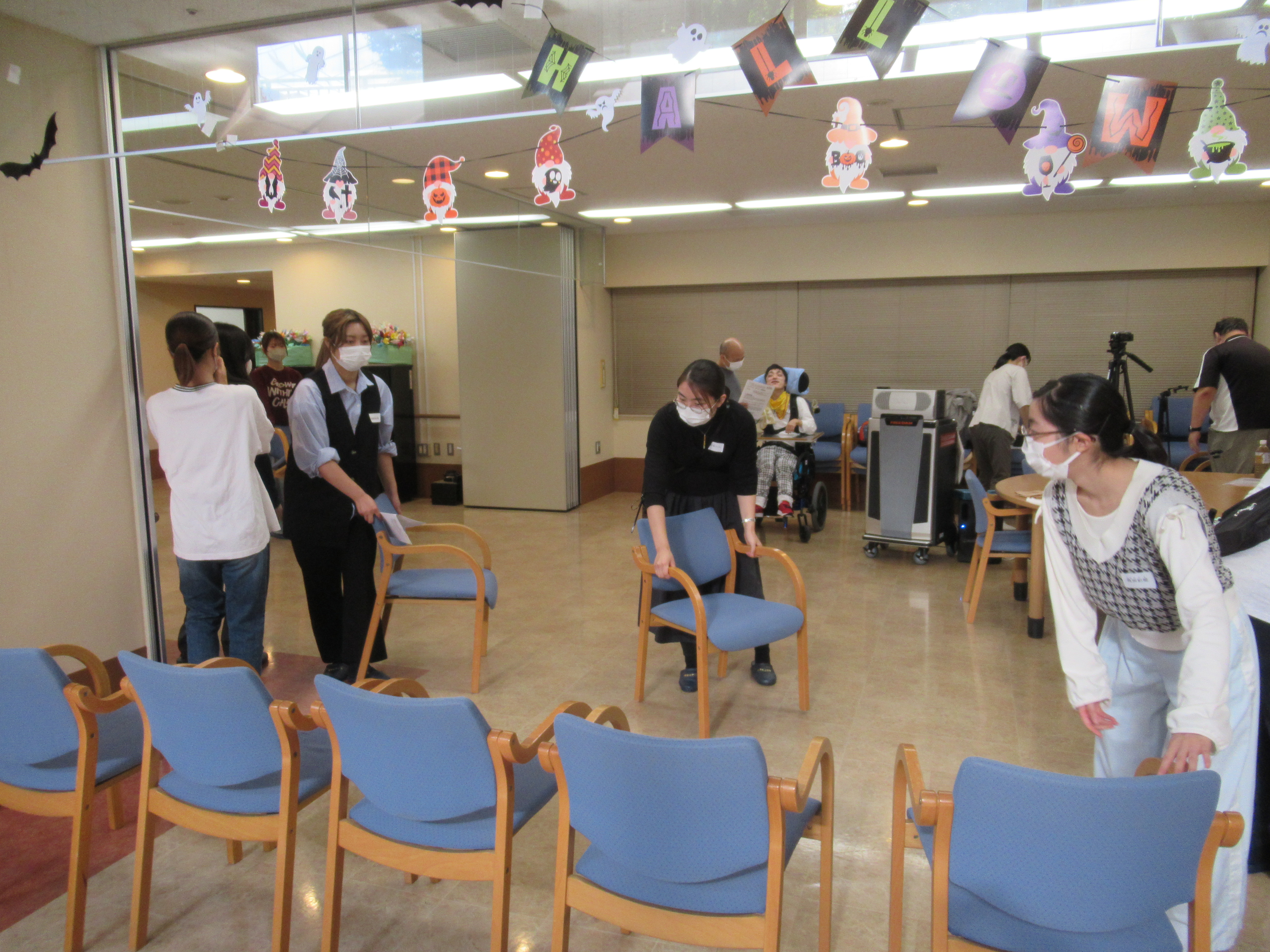 その後、ボランティア体験として、重度障がいのある方々とそのご家族、支援者と直接交流をする機会を持ちました。具体的には、認定NPO法人こつこつが主催するイベント「アートでおしゃべり」(※1)に参加し、会場設営等の運営サポートを行うとともに、イベントを通じて重度障がいのある方とのコミュニケーション方法を学びました。学生たちは、いくつかの方法の中から「指筆談」(※2)を体験し、障がい当事者と意志疎通ができた際には、驚きと喜びに満ちた表情を見せていました。発話が困難な方々も、適切なサポートがあれば自分のことばで気持ちを伝えられることを学生たちは身をもって実感しました。これはたいへん貴重な経験となりました。