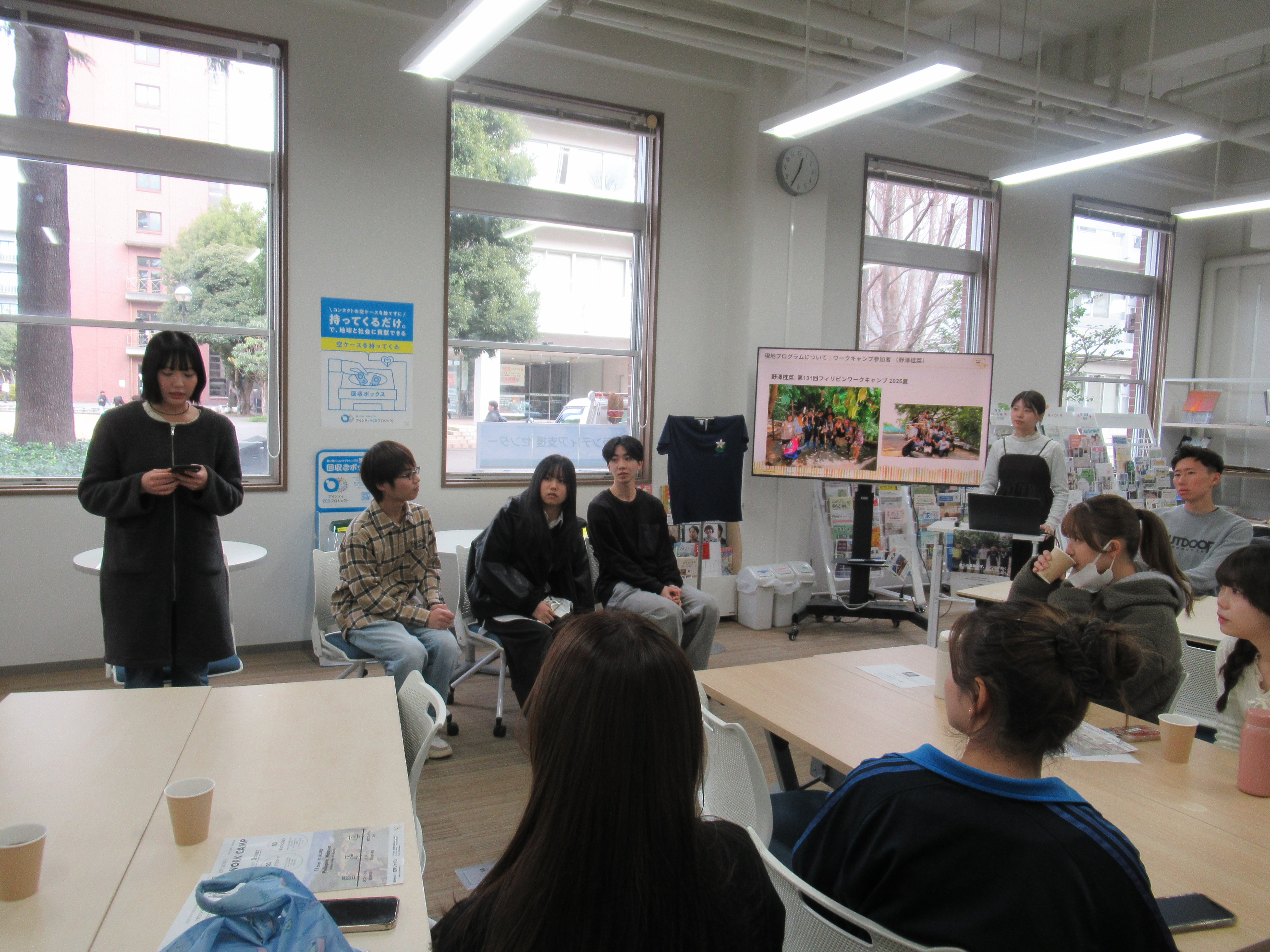 「ボランティアカフェ~春休みに向けた国際ボランティア~」として、前期授業最終日のお昼休みを利用して開催しました。今年5月に実施したボランティアカフェをきっかけに夏のプログラムに参加した本学学生から活動と来春のプログラムの紹介をしたいと相談があり、本企画を実施することになりました。学生4名を含む参加者5名が集まり、当日は参加できないけれど話を聞きたいという学生からの問い合わせもありました。