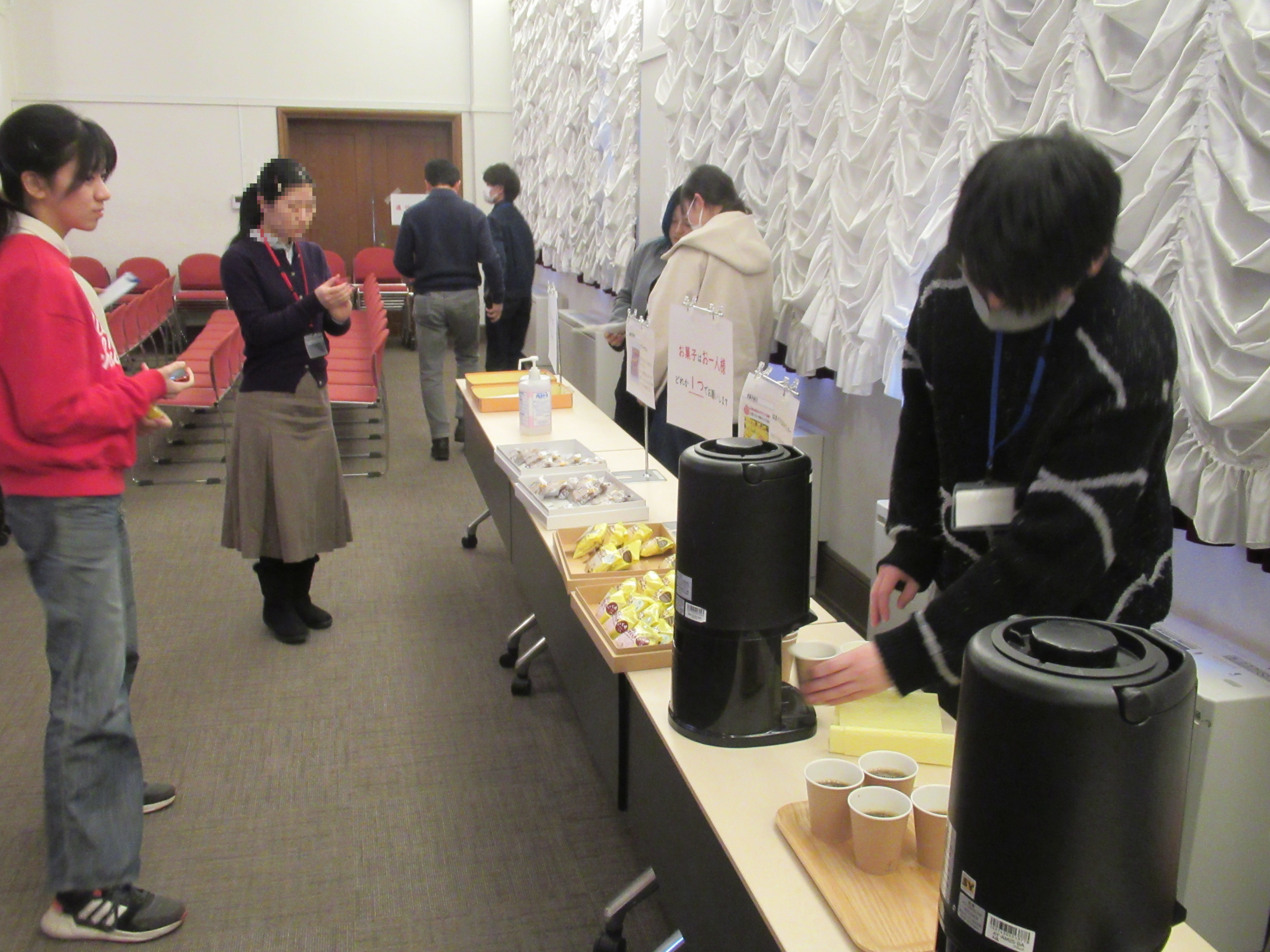 こうした経験を踏まえ、風間監督の映画「ただいま、つなかん」を活用した情報発信の機会として上映イベントを開催しました。参加者が被災地を自分事として考えられるよう、学生スタッフによるワークショップも同時に実施し、全員にアンケートを記入していただきました。また、気仙沼を身近に感じ、支援のきっかけとなるよう、ゆかりのお菓子や監督おすすめのアンカーコーヒーも提供しました。